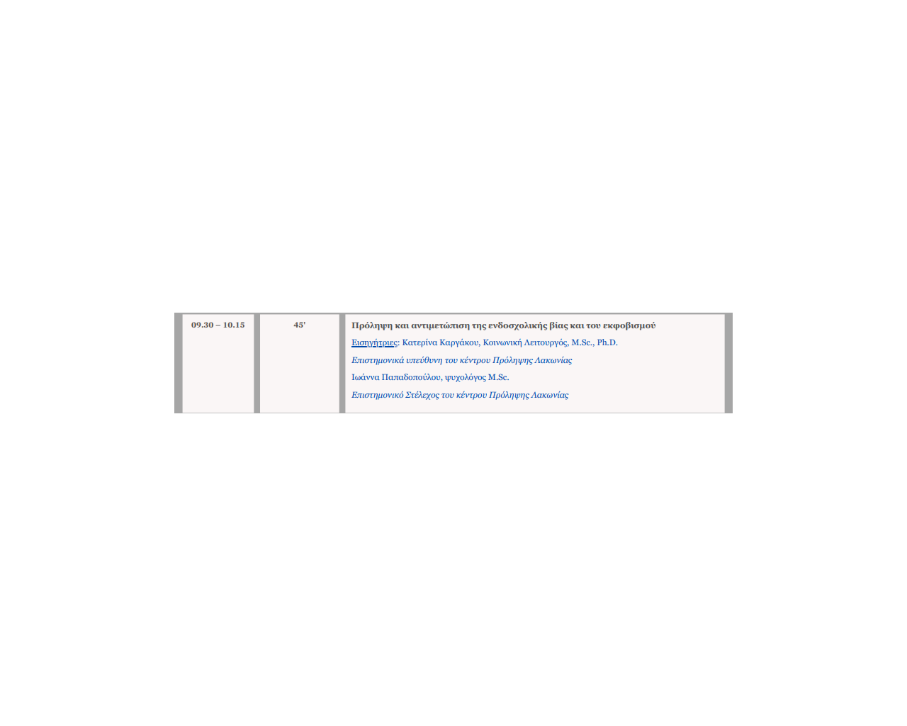 Στο πλαίσιο της συνεργασίας του Κέντρου Πρόληψης «Δίαυλος» με τη Διεύθυνση Πρωτοβάθμιας Εκπαίδευσης Λακωνίας και συγκεκριμένα με τον Σύμβουλο Εκπαίδευσης Δασκάλων Δ.Π.Ε. Λακωνίας κ. Ιωάννη Γιαννικόπουλο, εκπρόσωποι του Κέντρου συμμετείχαν στις Επιμορφωτικές Ημερίδες της Δ/νσης Πρωτοβάθμιας Εκπαίδευσης Λακωνίας με τίτλο «Οργανώνοντας τη νέα σχολική χρονιά: προκλήσεις και προοπτικές» που πραγματοποιήθηκαν στη Σκάλα και στα Παπαδιάνικα Λακωνίας στις 4 & 5 Σεπτεμβρίου 2024 αντίστοιχα. Στις Ημερίδες συμμετείχαν εκπαιδευτικοί από 20 σχολικές μονάδες και συγκεκριμένα από τα Δημοτικά Σχολεία Βλαχιώτη, Βρονταμά, Γερακίου, Γλυκόβρυσης, Δαφνίου, Κροκεών,Νιάτων-Αγίου Δημητρίου, 1ο Σκάλας, 2ο Σκάλας, Ασωπού - Φοινικίου, Κάμπου Βοιών, Κυπαρισσίου, Μολάων, Μονεμβασίας, Νεάπολης, Παπαδιανίκων, Ρειχέας, Συκέας – Μεταμόρφωσης, Ελαφονήσου και Ειδικού Δ.Σ. Μολάων. Ομιλήτριες από το Κέντρο Πρόληψης και με θέμα τον ενδοσχολικό εκφοβισμό, ήταν η Επιστημονικά Υπεύθυνη κα Καργάκου Κατερίνα – Κοινωνική Λειτουργός MSc, PhD και το Επιστημονικό Στέλεχος κα Παπαδοπούλου Ιωάννα – Ψυχολόγος MSc. Ευχαριστούμε για μία ακόμη φορά τη Διεύθυνση Πρωτοβάθμιας Εκπαίδευσης Λακωνίας για την εμπιστοσύνη και τη συνεργασία μας.