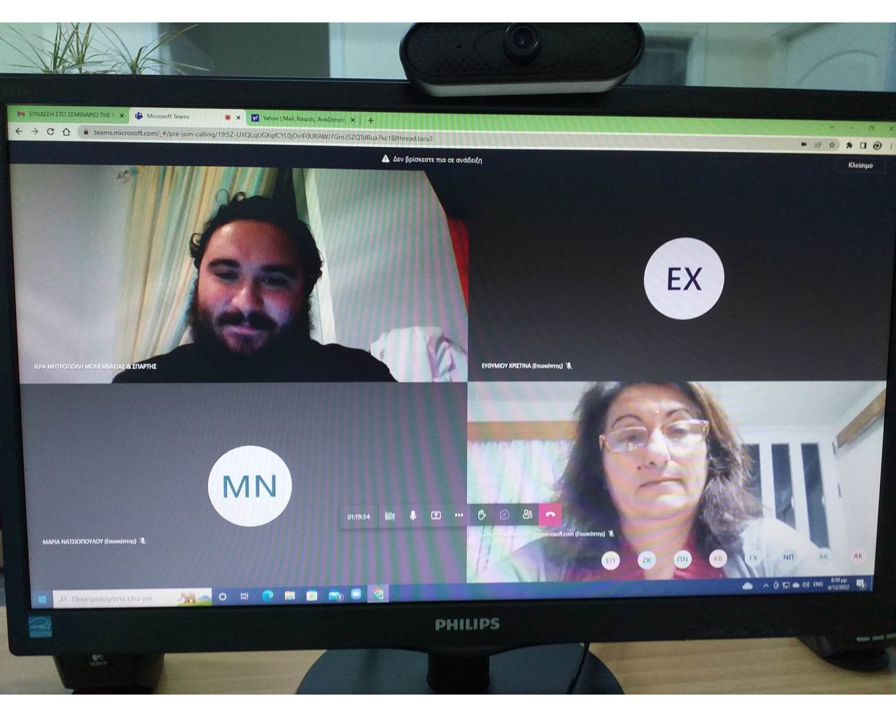 Την Κυριακή 04 Δεκεμβρίου στα πλαίσια του Σεμιναρίου για την επιμόρφωση Κληρικών και Λαϊκών Στελεχών Νεότητας της Ιεράς Μητροπόλεως Μονεμβασίας και Σπάρτης, πραγματοποιήθηκε με επιτυχία διαδικτυακή παρουσίαση – εισήγηση στη θεματική «Εθισμός στο διαδίκτυο». Εισηγήτρια ήταν η Ασπασία Γκουντούνα –Κοινωνική Λειτουργός & Επιστημονικό Στέλεχος του Κέντρου Πρόληψης «Δίαυλος».