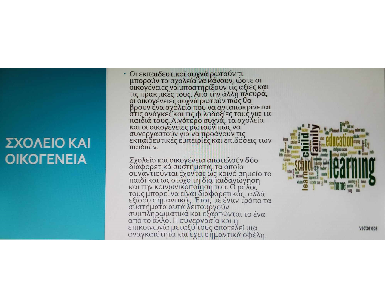 Τα τελευταία χρόνια γίνεται ολοένα και πιο φανερό ότι η συνεργασία σχολείου-οικογένειας λειτουργεί θετικά τόσο στη διαμόρφωση της προσωπικότητας των μαθητών όσο και στην εκπαιδευτική διαδικασία και στη σχολική επιτυχία.