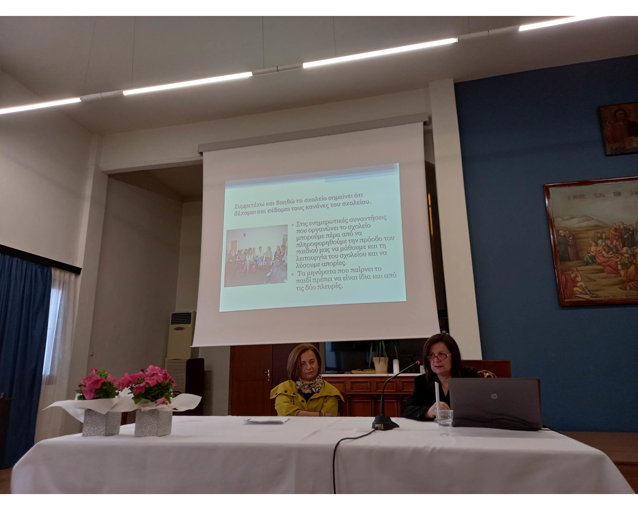 Οι θεματικές που αναπτύχθηκαν ήταν: "Επικοινωνία στην Οικογένεια" με ομιλήτρια την κ. Σμαρώ Στρατή Ψυχολόγο Υπεύθυνη ΚΔΑΠ-ΜΕΑ του Δ. Μονεμβασίας καθώς και "Επικοινωνία και Συνεργασία Σχολείου Οικογένειας" με ομιλήτρια την Κ. Ασπασία Γκουντούνα Κοινωνική Λειτουργό και Επιστημονικό Στέλεχος του Κέντρου πρόληψης Π.Ε. Λακωνίας "Δίαυλος"
