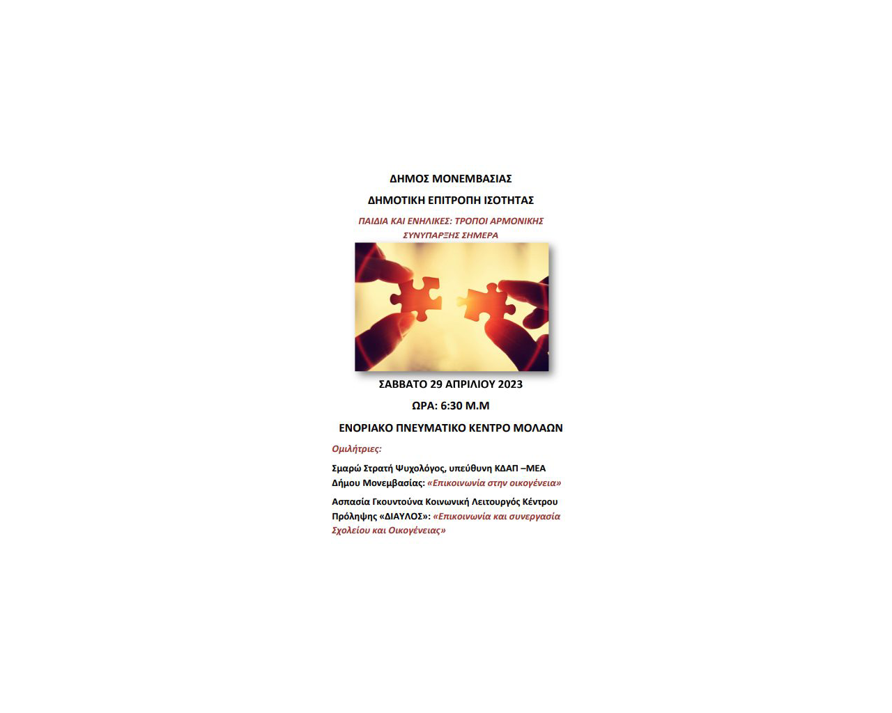 Τον Σάββατο 29 Απριλίου, πραγματοποιήθηκε στο Ενοριακό Κέντρο Μολάων Ημερίδα με τίτλο: "Παιδιά και Ενήλικες: Τρόποι αρμονικής συνύπαρξης σήμερα" που διοργάνωσε η Δημοτική Επιτροπή Ισσότητας του Δ. Μονεμβασίας.