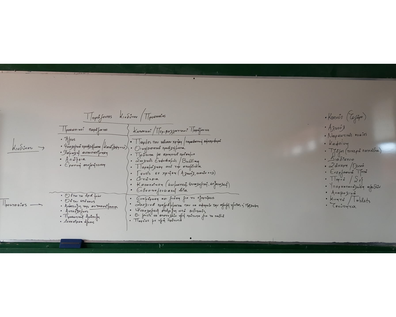 Στις παρεμβάσεις διαπραγματευτήκαμε τις πολλές και δύσκολες προκλήσεις που έχουν να αντιμετωπίσουν οι έφηβοι, όπως να είναι σε θέση να υπερασπίζονται τον εαυτό τους, να αναλαμβάνουν ευθύνες που πριν δεν είχαν, να παίρνουν αποφάσεις για την ζωή τους, να αναγνωρίσουν την επιρροή που δέχονται από τους άλλους, καθώς και τους παράγοντες κινδύνου και προστασίας αναφορικά με τις εξαρτητικές συμπεριφορές κ.λπ.