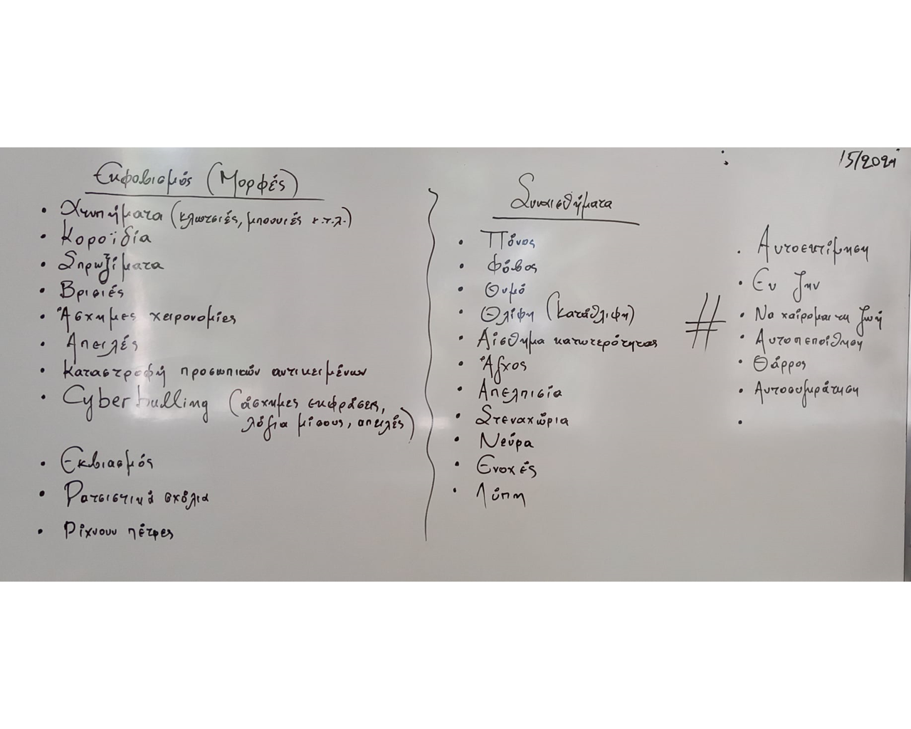 Με αυτά τα ερωτήματα και τους προβληματισμούς το Κέντρο Πρόληψης «Δίαυλος» σε συνεργασία την Δ/ντρια και τον Σύλλογο Διδασκόντων του Δημοτικού σχολείου Μολάων η Κοινωνική Λειτουργός και Επιστημονικό Στέλεχος του Κέντρου Ασπασία Γκουντούνα, πραγματοποίησε δύο βιωματικές παρεμβάσεις την Τρίτη 14 Μαΐου στους μαθητές του Δ2 τμήμα και την Τρίτη 22 Μαΐου του Στ2 τμήμα με θέμα την Πρόληψη του Ενδοσχολικού Εκφοβισμού.