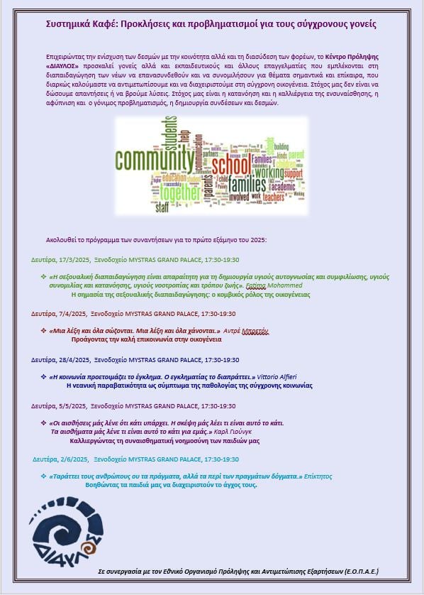 Την Δευτέρα 02 Ιουνίου, πραγματοποιήθηκε η 5η και τελευταία συνάντηση του 2ου κύκλου των συστημικών cafe που διοργάνωσε το Κέντρο Πρόληψης Ν. Λακωνίας «Δίαυλος» σε συνεργασία με τον ΕΟΠΑΕ, σε θεματικές που αφορούν την γονεϊκότητα.