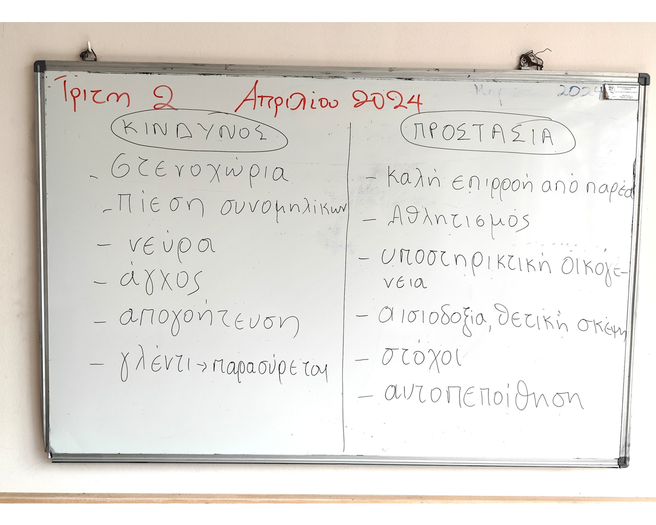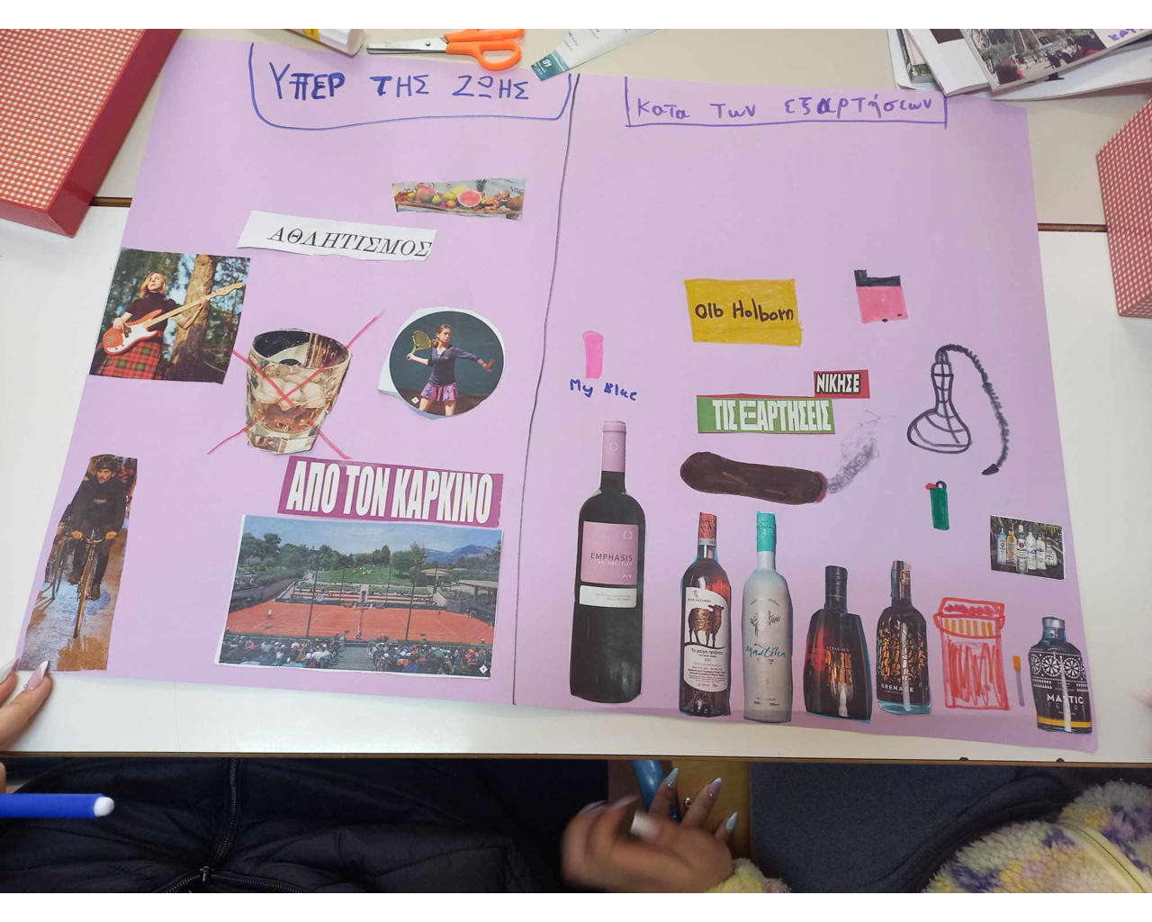 Σε αυτό το πλαίσιο, σε συνεργασία με το ΕΕΕΕΚ Μυστρά και τη Διευθύντρια κα Σωπιάδου Άννα, πραγματοποιήθηκαν βιωματικές παρεμβάσεις πρόληψης στους μαθητές με θέμα το αλκοόλ και το κάπνισμα στις 2 και 12 Απριλίου 2024. Εισηγήτριες ήταν το επιστημονικό στέλεχος κα Παπαδοπούλου Ιωάννα – Ψυχολόγος M.Sc και η επιστημονικά υπεύθυνη κα Καργάκου Κατερίνα M.Sc, PhD.