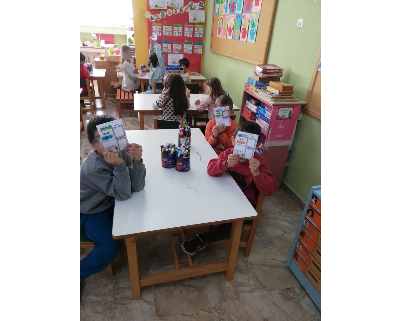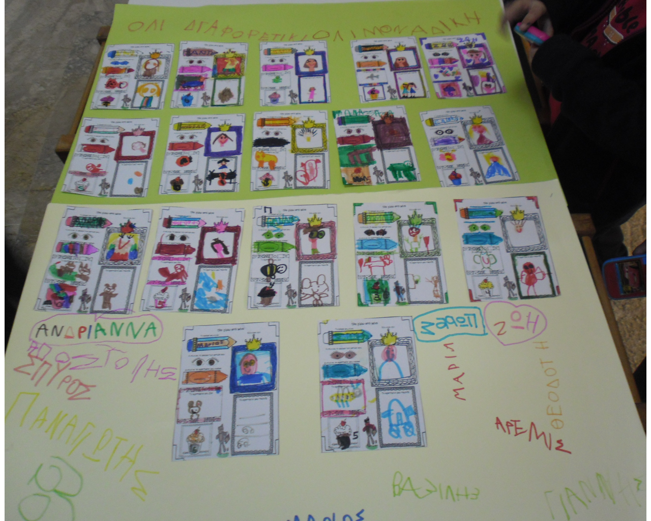 Επιπροσθέτως, τα παιδιά συνεργάσθηκαν και έφτιαξαν από κοινού αφίσα πάνω στην οποία υπήρχαν τα φύλλα εργασίας που έφτιαξαν κατά την διάρκεια της παρέμβασης. Μέσω της αφίσας αυτής διαφαίνεται η μοναδικότητα του κάθε μαθητή και πως όλοι μαζί αποτελούν μια ομάδα ο ένας πλάι στον άλλον.